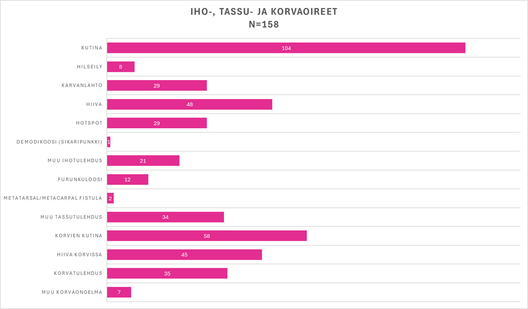 Iho-, tassu- ja korvaoireita on 30 %:lla vastausten koirista. Selvästi yleisin oire on kutina, josta kärsii 2/3 oireisista koirista, eli 20 % kaikista vastausten koirista. Seuraavaksi yleisimmät oireet ovat korvien kutina, hiiva yleisesti ja hiiva korvissa. Alla olevassa kuvassa on esitetty erilaisten oireiden jakautuminen oirehtivissa koirissa. Yhdellä koiralla voi siis olla useampia erilaisia oireita.