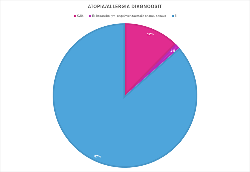 Seuraavassa kuvassa on esitetty koirien varsinaiset diagnoosit allergian/atopian osalta eli 12 %:lle kaikista vastausten koirista (66 koiraa) on diagnosoitu atopia ja/tai allergia jonkun tahon toimesta. Diagnoosin on tehnyt 30 koiralle alaan erikoistunut eläinlääkäri ja 31 koiralle yleiseläinlääkäri. Viisi on omistajien omadiagnosoimia. Diagnosoiduista koirista noin puolella on atopia ja noin neljäsosa on ruoka-aineallergisia sekä neljäsosalla on jonkinlainen yhdistelmä molempia.
