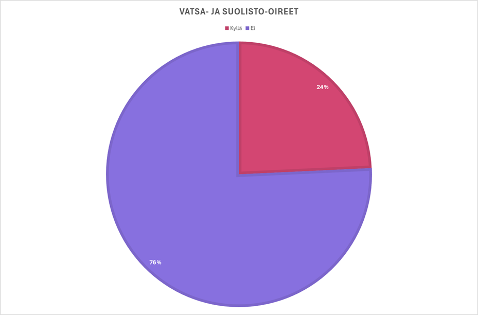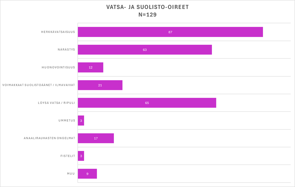 Seuraavassa kuvassa on esitetty erilaisten oireiden jakautuminen. Yhdellä koiralla voi siis olla useampia eri oireita. Oireilevista koirista 2/3:a vaivaa herkkävatsaisuus. Muita tyypillisimpiä vatsa- ja suolisto-oireita ovat närästys ja löysä vatsa tai ripuli, jotka ovat oireina puolella oireilevista koirista.