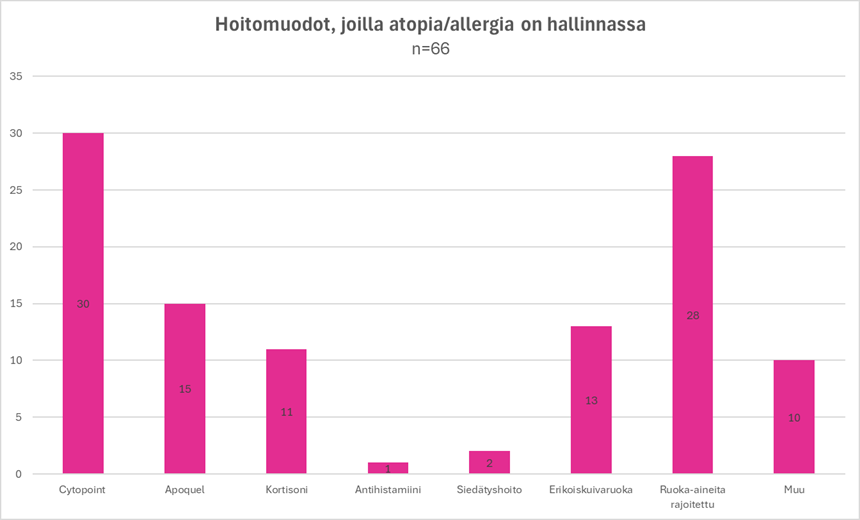 58:lle (88 %) näistä diagnoosin saaneista koirista on löytynyt sopiva hoitomuoto tai eri hoitomuotojen yhdistelmä, jolla oireet on saatu hallintaan. Käytetyt hoitomuodot löytyvät alla olevasta kuvasta. Valitettavasti 8 koiralle ei ole sopivaa hoitomuotoa oireiden hallintaan löytynyt, vaikka useita kuvassa näkyviä hoitomuotoja tai niiden yhdistelmiä on kokeiltu.