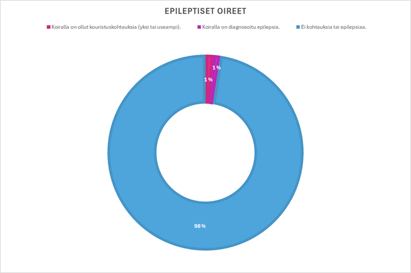 Kouristuskohtauksia saaneiden ja epilepsiaa sairastavien koirien osuus vastanneista on esitetty alla olevassa kuvassa. Koirista 7 on saanut yksittäisiä tai useampia kouristuskohtauksia, joita ei ole diagnosoitu epilepsiaksi, pari näistä selkeästi jo vanhemmalla iällä (yli 9 v.), jolloin taustalla on todennäköisesti jotain muuta kuin idiopaattinen epilepsia. Yksittäisen kohtauksen syy on usein jäänyt selviämättä.