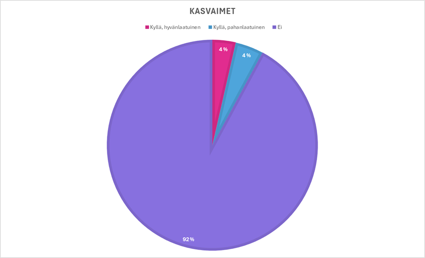 Muiden sairauksien osiossa käsiteltiin vielä kasvaimet, pois lukien nisäkasvaimet. Seuraavassa kuvassauvassa on esitetty kasvaimin yleisyyttä. Kasvaimia on todettu 8 %:lla kyselyn koirista, jotka jakautuvat suunnilleen tasan hyvän- (19) ja pahanlaatuisten (23) kesken. Hyvänlaatuisissa kasvaimissa on usein kysymys mm. ihoon liittyvistä pateista/kasvaimista. Pahanlaatuisissa kasvaimissa dominoi pernakasvaimet noin 30 % osuudella, myös mm. luusyöpä ja hemangiosarkooma nousevat esiin erilaisten kasvaimien joukosta. Kasvainsairaudet/syöpä on Kennelliiton jalostustietokannan kuolinsyykirjausten mukaan valitettavasti yleisin valkoisenpaimenkoiran kuolinsyy vanhuuden jälkeen peräti 19 % osuudella, kun vanhuus on merkitty syyksi 22 %:lla kuolleeksi merkityistä koirista.