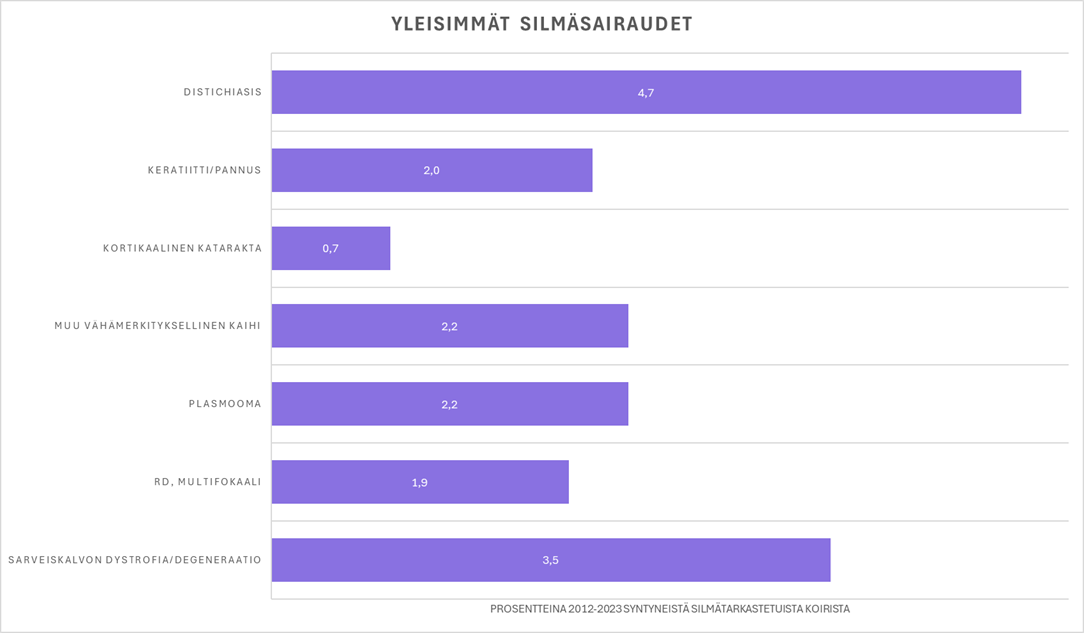 Jalostustiekannan mukaan vuosina 2012–2023 syntyneiden koirien yleisimmät silmäsairaudet ovat distichiasis (ylimääräiset ripset), sarveiskalvon dystrofia/degeneraatio, muu vähämerkityksellinen kaihi, pannus ja plasmooma. Kun huomioidaan, että erityisesti pannusta ja plasmoomaa diagnosoidaan runsaasti virallisten silmätarkastusten ulkopuolella, on näiden autoimmuunitaustaisten silmäsairauksien esiintyvyys rodussa huomattavasti jalostustietokannan lukuja suurempi, jopa kaksin-kolmikertainen.